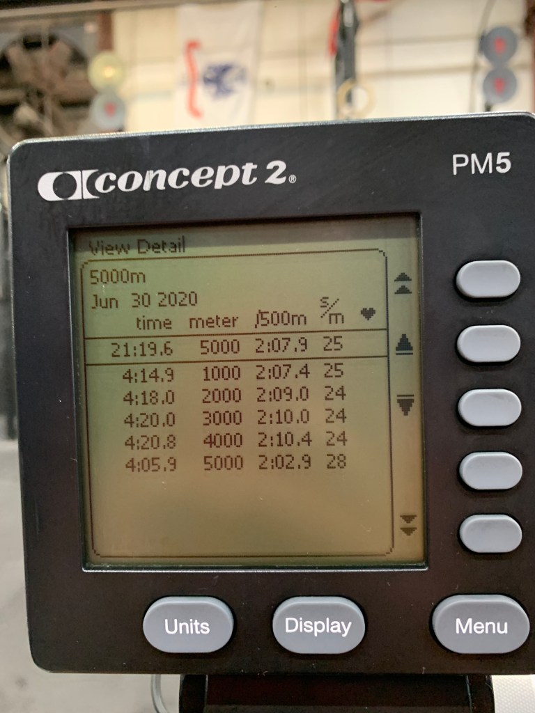 =Felt solid. 10 seconds slower than last 5k test and I will take it considering I have not done row club in 2 weeks, coming off this cut and the general state of my body/energy the last 2 weeks. I felt like I stuck to my pace (I was aiming for 2:07 average) and wanted to keep all splits below 2:10 or better. Noticed the energy difference (lack thereof) the most towards the end when I started to push pace, just felt like I did not have much gas in the tank, it was extremely difficult to get much under 2:00pace in each pull. I was gassed at the end so feel like I paced well and pushed well at the end but just did not have as much to give today